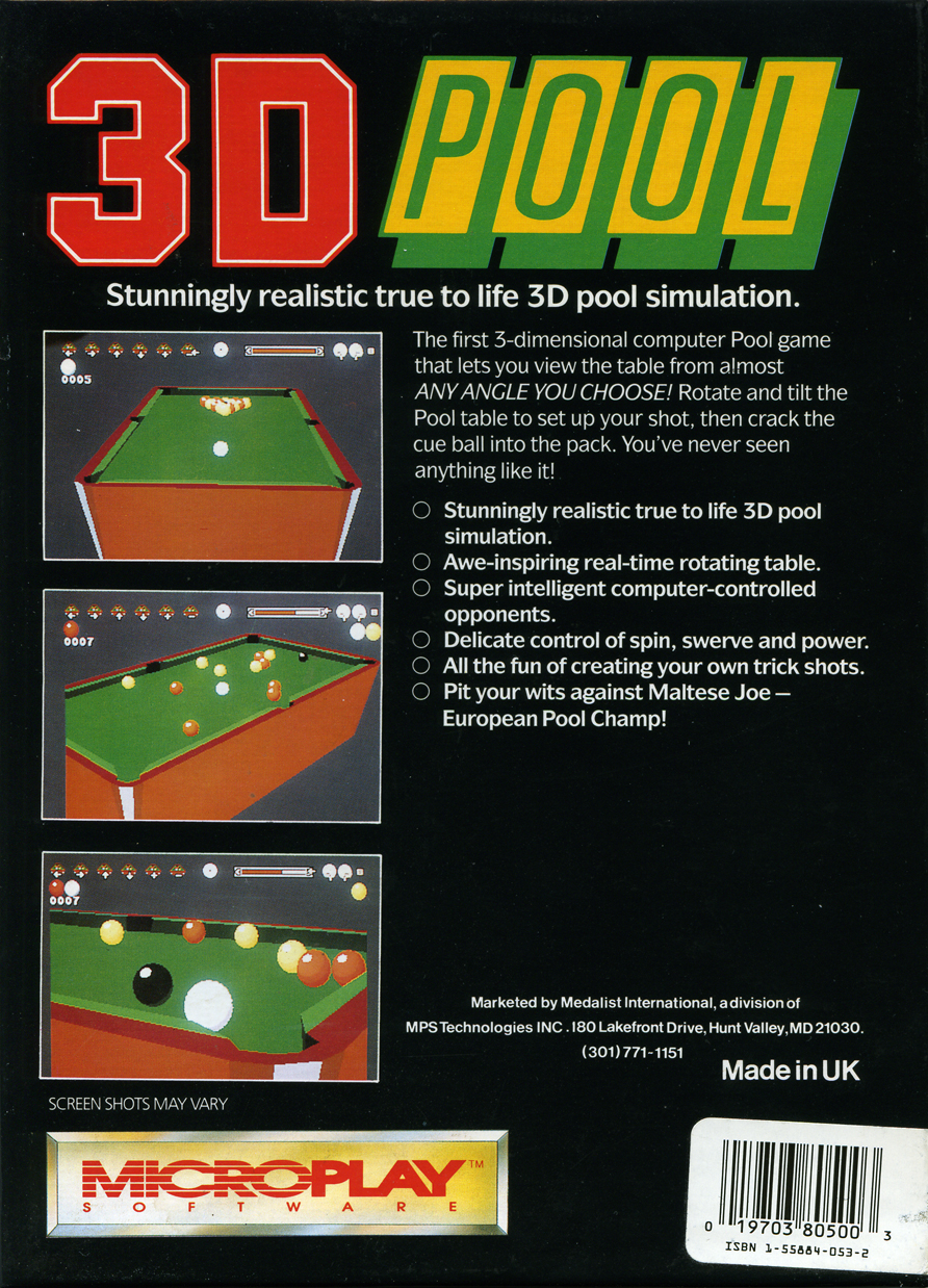 | __long_description | Sharkey's 3D Pool is one of the earliest 3D cue-sports games, featuring a fully-rotating table and variable viewpoint allowing for much more realistic shot-playing than the traditional top-down game style (although the game can be played this way instead). The pace, spin and angle of each shot can be set up precisely before playing it. Both 8-ball (pot your seven colors plus the black to win) and 9-ball (pot the 9-ball with a shot that also hits the lowest remaining ball, whatever that may be) are included.