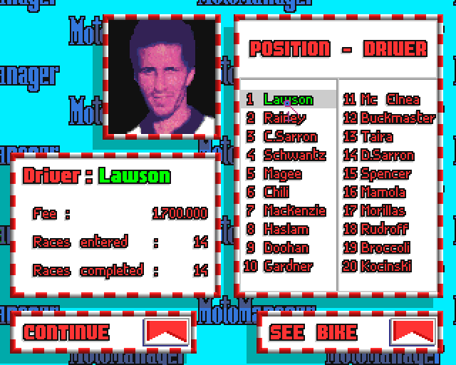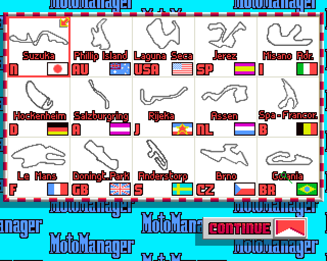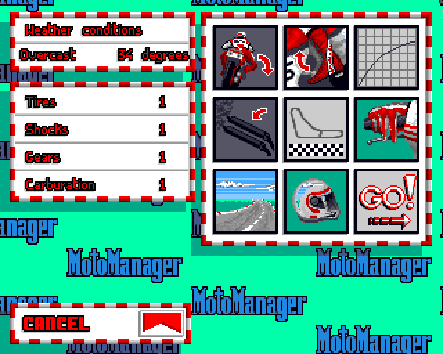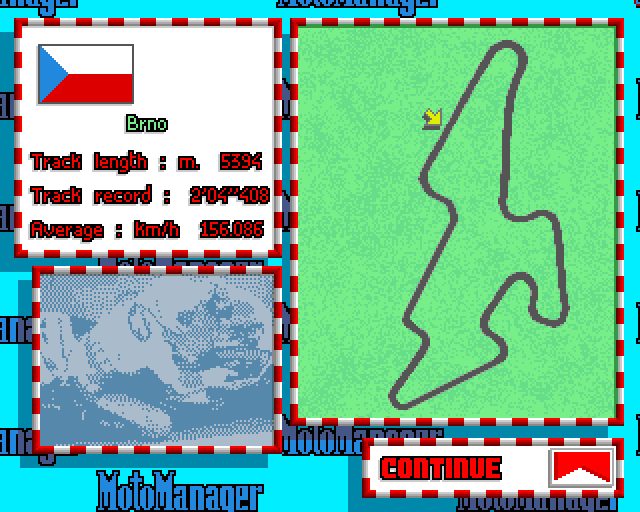 In this game the player manages a 500cc motorcycling team, starting with a certain budget of around $4,000,000. The gameplay includes the economical and technical management, motorcycle riding simulation on the famous circuits such as Phillip Island, etc., and management of the racer actions during the race.