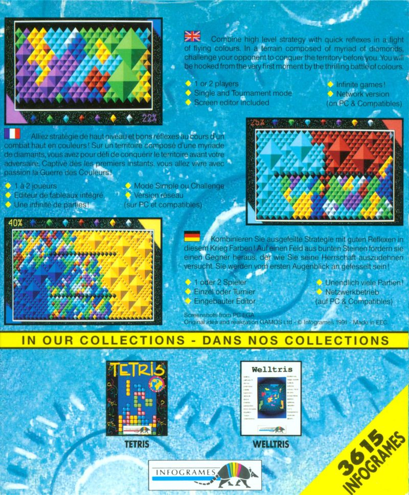 | description | In the wake of Alexey Pajitnov's block-busting Tetris, Infogrames licensed another Russian mathematician's concept for a game of logics and dexterity: Two players start from opposite ends of a board, filled with rectangles of seven different colors, and take turns in picking one of these colors. All diamonds of that color bordering on the player's territory are annexed, expanding the borders. Whoever first controls more than half of the terrain wins. |