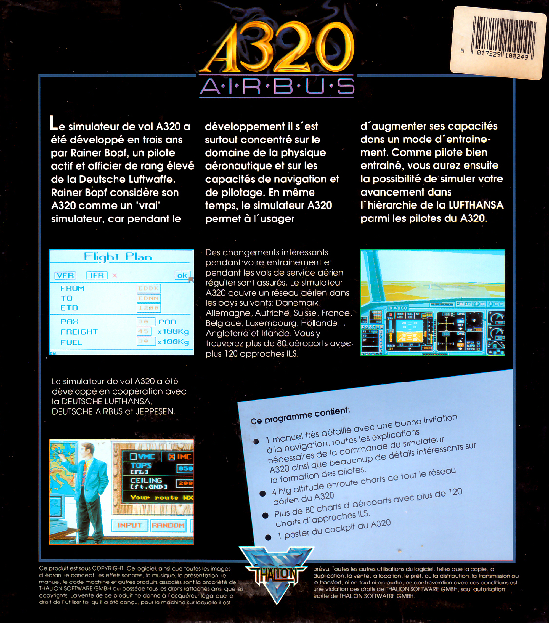 | __long_description | A320 Airbus is a flight simulator personal computer game released in 1991 in which the player pilots an Airbus A320. The game was developed over three years, with cooperation from Lufthansa, Deutsche Airbus and Jeppesen. Originally the game was written by Rainer Bopf on Amiga and converted to the Atari ST by Christian Jungen. Last known version of the game is 1.44.