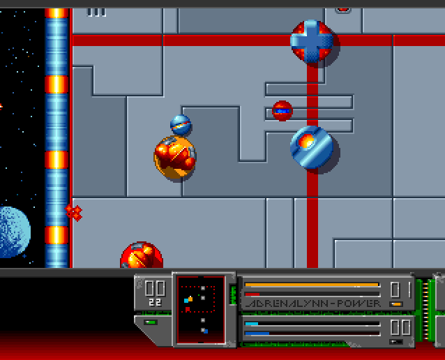 Adrenalynn is a futuristic, action-oriented sports game. Artificial Intelligence took over Earth and the winner of the "Adrenalynn" championship may decide humanity's future. So naturally the player participates with the goal to win the major league (there are overall three with increasing difficulties). The game itself is a bit like indoor soccer with four athletes (armed with guns) and on a smaller playing field with bumpers. A match lasts 120 seconds and there are various power-ups to collect. Each player only takes control over a single athlete. The sportsmen show up on the screen as balls.