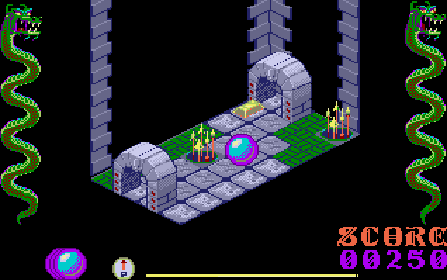 These items have to be collected in the maze which consists of 150 isometric rooms. These can be explored freely but sometimes you need to have special objects to proceed, e.g. a candle in dark rooms. The dangers consist mostly of sharp objects which can cause your ball to burst. Additionally you are on a timer because your balloon loses air constantly. But it can be refilled by using pumps which can be found in the maze - but you have to leave them in time or you explode because of overpressure. |