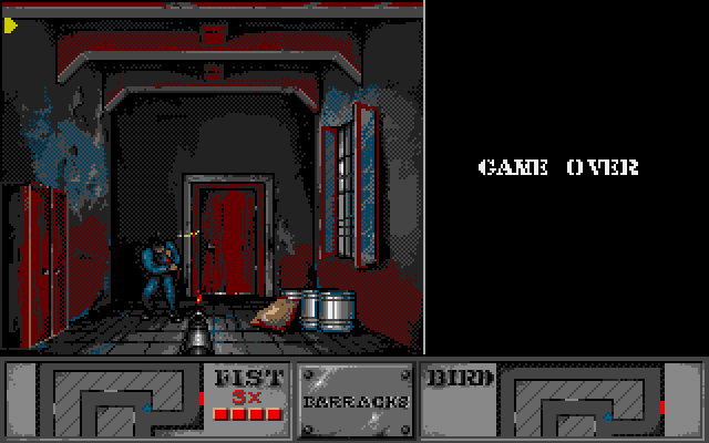 Once inside a building, the game switches to a first-person view, in which the player has to navigate a maze to reach his goal, e.g. recovering evidence. To his disposal are a radar and a rifle.