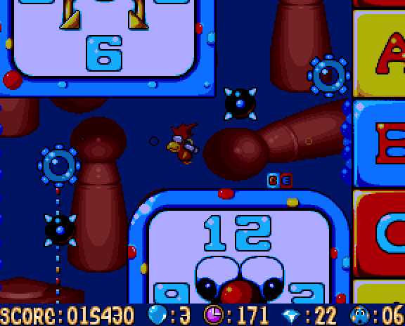 To complete a level, Alfred must find and peck all the balloons. The last balloon will take him to a boss fight. If Alfred dies, he starts as an egg located at the last balloon pecked.