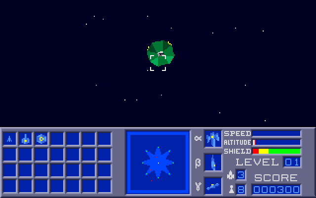 Each of the levels can be freely navigated (the ship's speed is automatically throttled when the invisible walls are reached) and the inhabitants stand around on pre-defined places. The aliens have various ship types with different behaviour patterns which either try to destroy the player's ship or collect the inhabitants and bring them into the aliens' invincible station. There they are transformed into especially powerful enemies (mutants). Besides the first-person view on environment, there are some instruments at the bottom of the screen, e.g. a list of present enemy types, a radar, speed, altitude or shield level. The latter represents the life energy and causes death when fully depleted. Additional lives are gained after earning enough points by shooting enemies. Besides dying, another way to lose the game is failing to keep at least one inhabitants alive. |