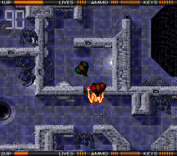 Moving around an alien-infested complex in a top-down view, you must at all times keep an eye not only on your energy level, but also be conservative with ammunition. Though you will find new ammo cartridges strewn around the levels, they are consumed quickly by respawning aliens that may come crawling out of the floors and walls when you least expect it. On the floors, you will also find keys for passing through locked doors. Keys must also be used with care, or you may find yourself locked out of a room containing the remaining keys that you will need in order to complete the level. Other doors are one-way, and will electrocute you if you try to pass it in the other direction. |