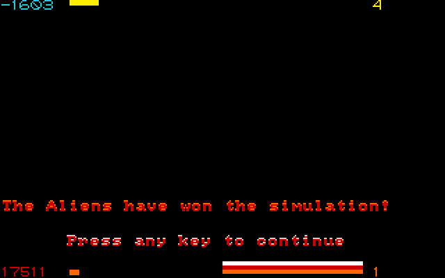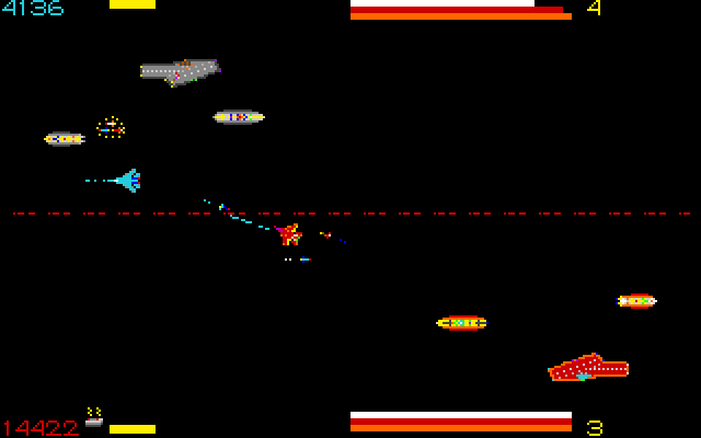 Alien Strike makes use of digitized images, music, and speech, which is noteworthy for a 1987 release. The in-game screen is separated by a line into two sides. Each player controls a jet. You have to shoot the carriers and ships on your enemy's side of the screen while preventing the other player from destroying yours. The game speed is insanely high. You probably won't stand any chance against the computer, but with two players, this could be fun for a short while.