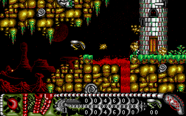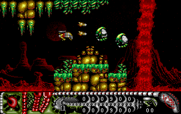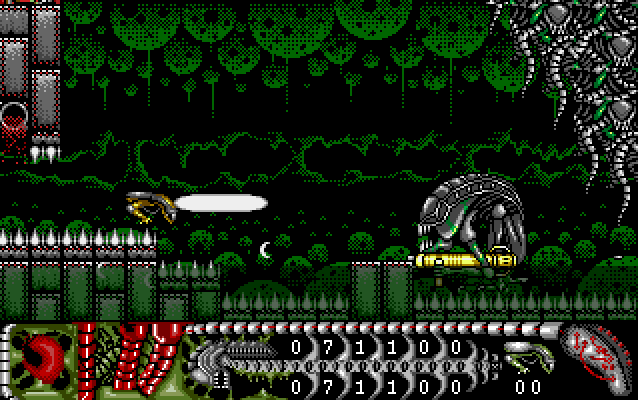 Alien World is a scrolling shoot-em-up. Various levels scroll horizontally while others scroll vertically. The screen will only scroll when you move so far across the screen. You cannot re-trace your steps. As well as the main playing area you can also see your score, amount of Zen, Energy dots, lives and various weapons. The joystick moves Kai, but not touching the joystick lets gravity kick in. The fire button fires your weapon.