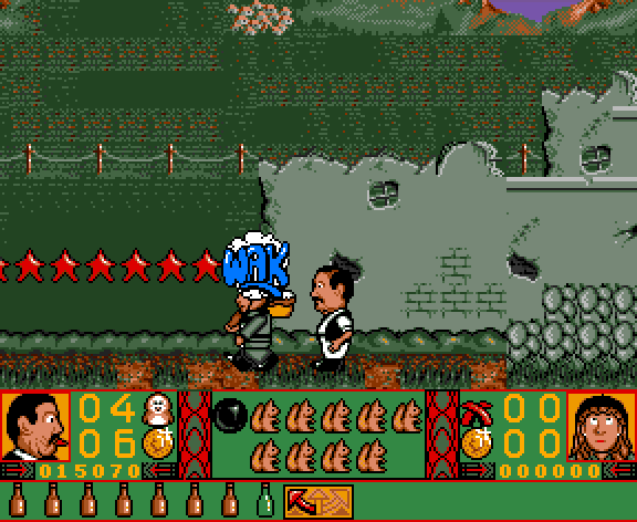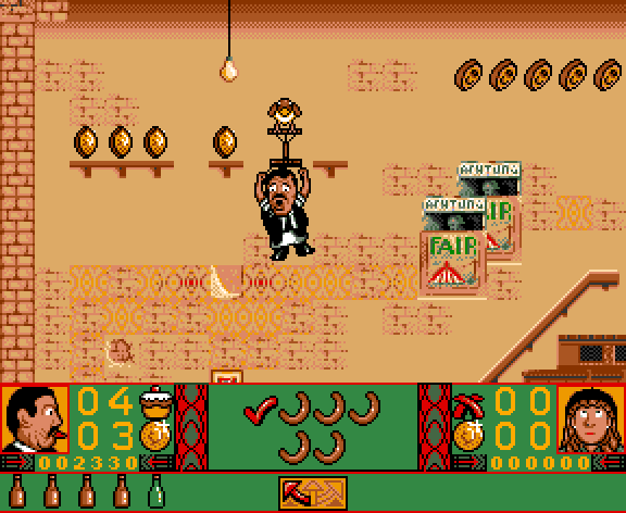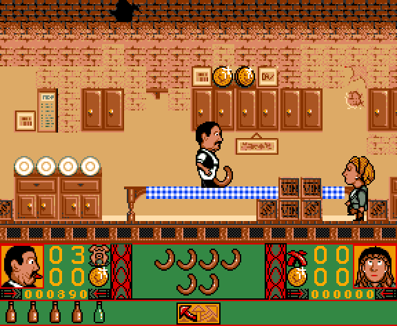Based on the highly popular 80s sitcom. You take control of Rene Artois, the charismatic French man (in two player co-operative mode player 2 is Michelle). They are on a mission to recover stolen paintings. The player must negotiate various enemies and navigate through different buildings. The player can replenish the life bar by collecting bottles. Various non-playable characters from the show help by throwing objects or distracting enemies.