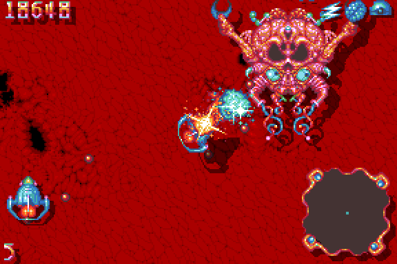 There are two ways to successfully complete the level - destroy enough of the infection to allow the planet to survive, or rescue enough of the citizens, Defender-style. For each of the organs to be destroyed, a specific weapon can be created to cleanse it easier - blueprints must be collected and taken back to your ship for this. |