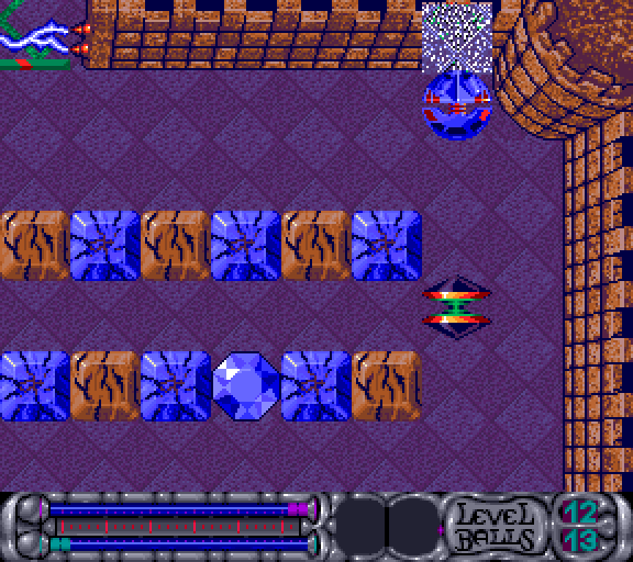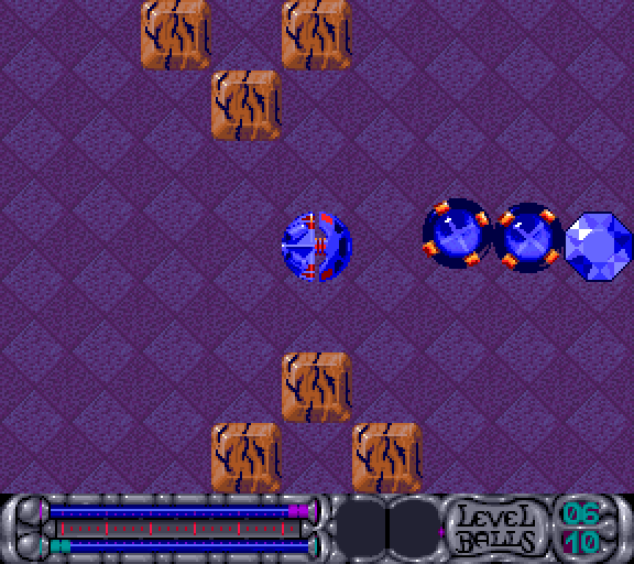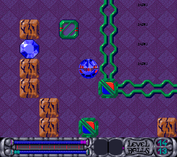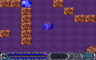 Arena is a puzzle game with strong action elements. In each of the about hundred levels, the player controls a space ship in a top-down perspective and needs to arrange diamonds in a certain order. Similar to Atomix, once pushed, those diamonds keep going until they meet an obstacle like a wall or a teleporter. Some of the obstacles can be interacted with. This means the player needs to plan ahead in order to avoid getting into an unwinnable situation. However, the level can be restarted up to three times without repercussions.