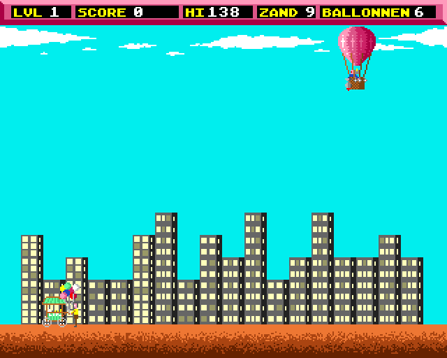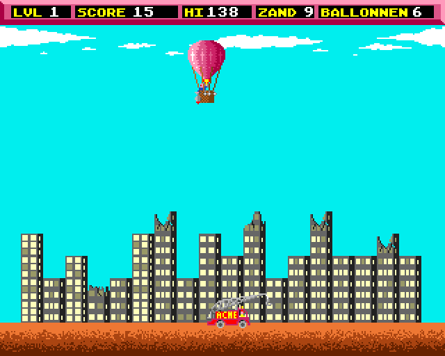 The game can be described as upside-down space invaders. You fly your balloon from the right of the screen to the left and then appear at the right of the screen again but one block closer to the ground. You have randomly generated building which you drop bombs on to until you have destroyed them all. To stop you getting to low you have sand bags which you can drop to gain height. You also need these to dodge seagulls that are heading for your balloon.