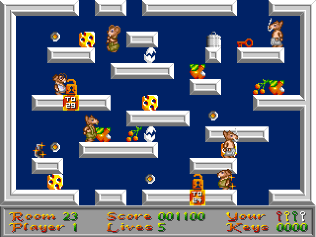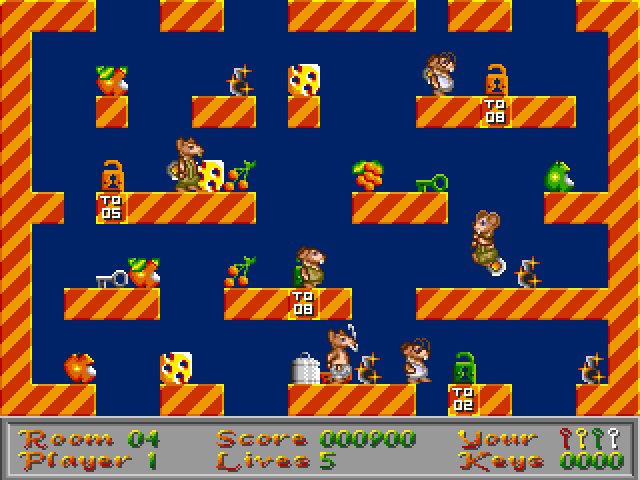 Barney Mouse is a single-screen platform arcade game. The player controls a mouse named Barney. Barney must find keys to move on to the next room. He must avoid other, hostile mice - if somebody touches him, Barney loses a life. He can collect various fruit for points. Rooms have multiple exits, each with different keys.