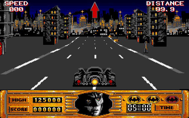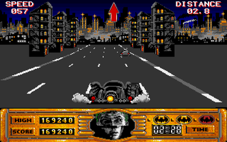 The game consists of five stages based on events from the movie. Each stage has a time limit and a health gauge (represented by Batman's face turning into the Joker's), with Batman losing a life if he runs out of either. The first stage sees players controlling Batman as he navigates the Axis Chemical Plant to confront Jack Napier, leading to the incident in which he becomes The Joker. In this level, the game features side-scrolling gameplay, in which Batman can use his Batarangs to defeat enemies or and his grapple gun to reach higher platforms and swing across gaps. In the second level, Batman rides in his Batmobile where he must dodge traffic and use a grapple to swing around corners to avoid running into the police. The third level is a puzzle section in which Batman must identify various components for Smilex, the deadly chemical Joker has put into the market. The fourth level takes place during Joker's parade, in which Batman must use the Batwing to cut away balloons filled with poisonous gas without hitting the balloons themselves. Finally, the fifth level, which reprises the gameplay of the first level, sees Batman make his way to the top of Gotham Cathedral to finally confront Joker.