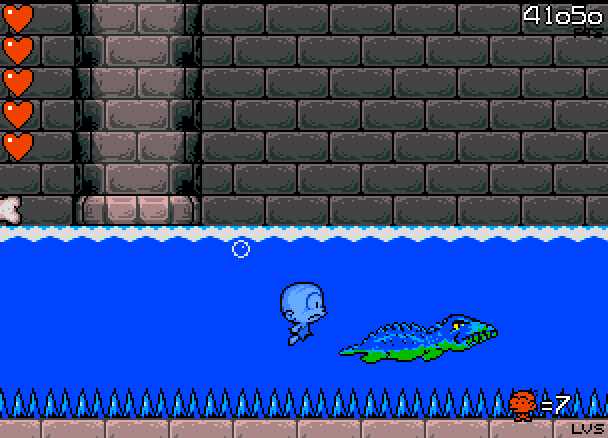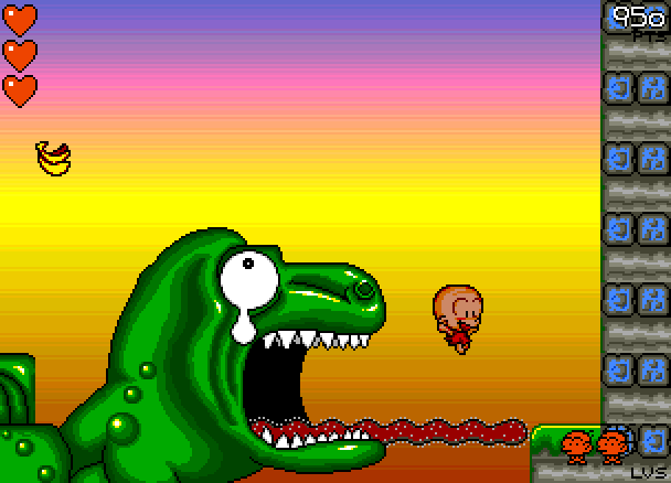 The game is also known for its trademark gameplay mechanism of 'spin attack', where Bonk floats through the air if you have the turbo button on. This can be used to float around the level and reach areas for extra/hidden items, but also as a method of attack as well. The game starts you off with 3 hearts, but allows you to increase this number when you find special heart container items, allowing Bonk to take a number of hits before dying.