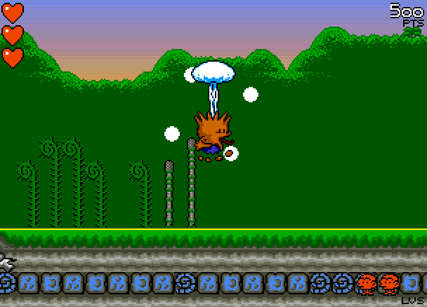 A variety of bonus stages can be found throughout the game, which provide bonus points upon completion and thus resulting in accumulating extra lives. Enemies themselves can be 'milked' for points in that you can keep 'bonking' their dead bodies and not letting them hit the ground. Spin attack is another method for doing this.