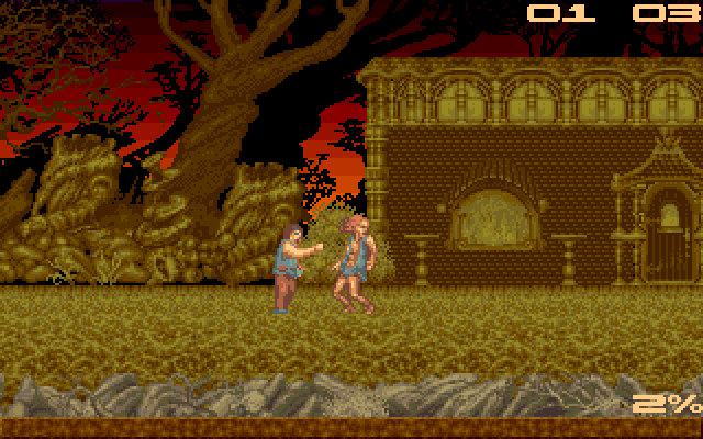 The interaction with enemies offers no surprises: the player can perform a variety of combat moves in order to beat them up. Disposed enemies leave items behind, mostly food and money. However, the game requires the player to solve various puzzles in order to progress and to talk to the animals and humans found in the levels. Usually certain items need be found and used at the correct spot respectively traded for another item. Those non-fighting actions are initiated through a pop-up menu. The game also features basic magic, a day/night cycle (some actions are only possible at a certain time) and hunger which causes the need for constant fighting in order to keep the steadily decreasing energy bar up.