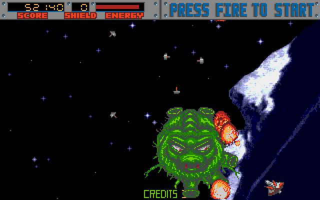 In this case the Asteroids are protecting Mukor, an evil being who is poisoning planets under the Colonising Corp’s control. Each level is split into either 9 or 16 sub-levels, which are chosen through a square in which any remaining level which is adjacent to the last level completed can be selected. There are 3 different ships (Speeder, Fighter and Warrior), which can be switched between at any time. Power-ups (including improved weapons, shield recharges and a faster thrust) can be collected by flying into them.