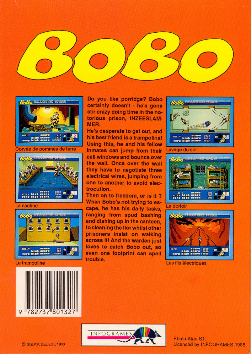 | __long_description | BoBo is a cartoon style arcade game. The main character is Bobo, an inmate who has been sentenced for seventeen years. He must do many chores, such as peeling potatoes, ladling soup to his fellow prisoners, helping his fellow prisoners to escape, jumping electric wires and singing lullabies to his snoring cell mates. It is possible to play through the events in a sequence or one at a time. Up to six players (alternating, not simultaneously) can play this game. Each event can be played with joystick or keyboard. The specific moves you have to make vary from event to event but it come basically down to moving the joystick or keyboard keys fast from left to right. It is also possible to pick things up and toss them.