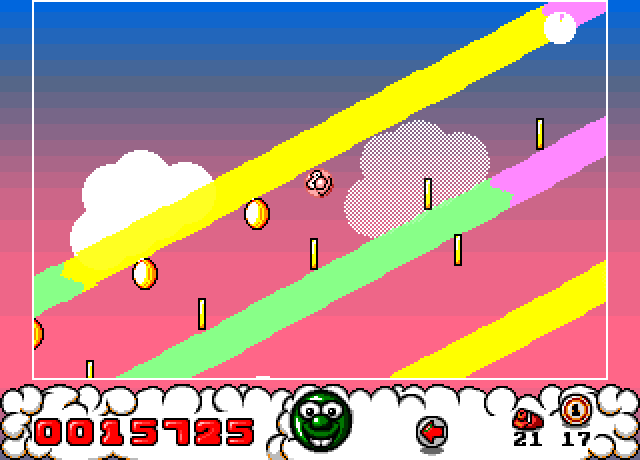 There are a host of special 'power-ups' across the level as well. The simplest ones (and the first ones the player will meet) change the direction of gravity, causing the player's character to automatically 'fall' to the left when not in motion. Others include a sticky mode where Bob stops bouncing (unless the player presses the fire button), a heavier-bounce mode, and a very useful one allowing the player to 'thrust' Bob around, ideal for reaching precariously-placed coins.