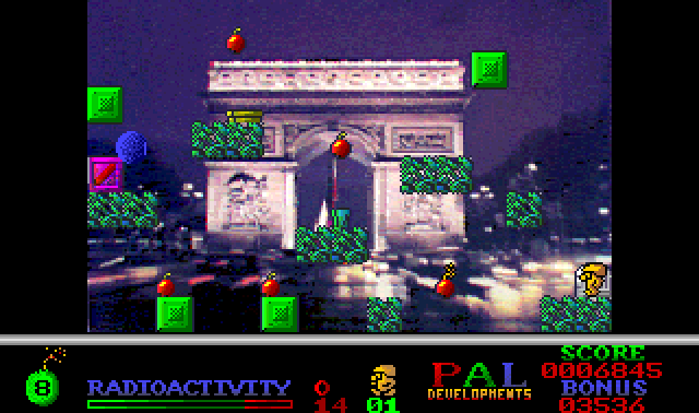 As you defuse the bombs, fuel capsules are sprayed out by a pipe and a certain number also need collecting and put in a box and you can carry as many capsules as you want. To reach higher platforms you can either use pipes that make you bounce higher or you can fall of the bottom of the screen to appear at the top. Moving about the screen is a ball and if you touch it carrying capsules then you lose them and you also increase the radiation meter. Once you have collected enough capsules and defused a certain amount of bombs then you move to the next level.