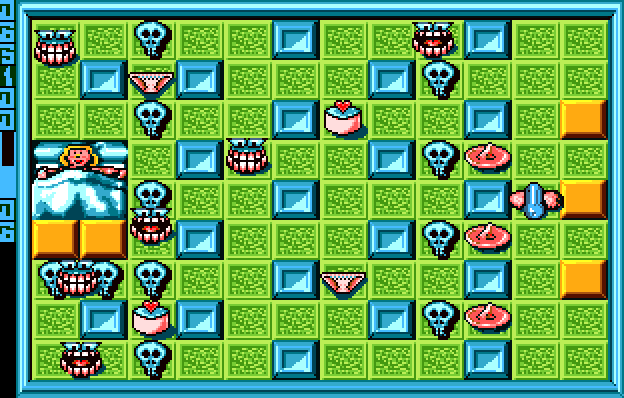 The player's "shot" can be used to temporarily neutralise enemies, open gaps in walls (revealing in the background a picture of a naked lady), or stun competitors in the multiplayer (up to 4 players) game. Once enough bonuses have been collected, doff a condom and hop into the sack with the blonde in the middle of the screen. Level layouts vary, but basic gameplay (and even the cheesecake in the background) remains much the same through 50 levels.