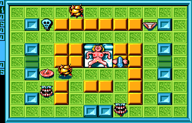 The player's "shot" can be used to temporarily neutralise enemies, open gaps in walls (revealing in the background a picture of a naked lady), or stun competitors in the multiplayer (up to 4 players) game. Once enough bonuses have been collected, doff a condom and hop into the sack with the blonde in the middle of the screen. Level layouts vary, but basic gameplay (and even the cheesecake in the background) remains much the same through 50 levels. |