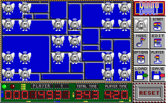 Booly is a puzzle game with a similar concept to Gem’X in some ways. You are presented with a top-down view of an array of inter-connected blocks, which are shown in a variety of colours. The aim is to turn them all to grey, but clicking on them (using the pointer you are in control of) will often cause a pattern of other squares to change to the next colour in the sequence as well. You are doing all this with a time limit for each of the 300 levels. A level designer allows you to create your own sequence of up to 1000 levels.