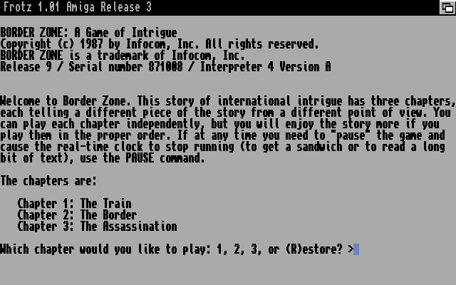 Game was never officially released for the Amiga. This version is interpreted using the program Frotz.