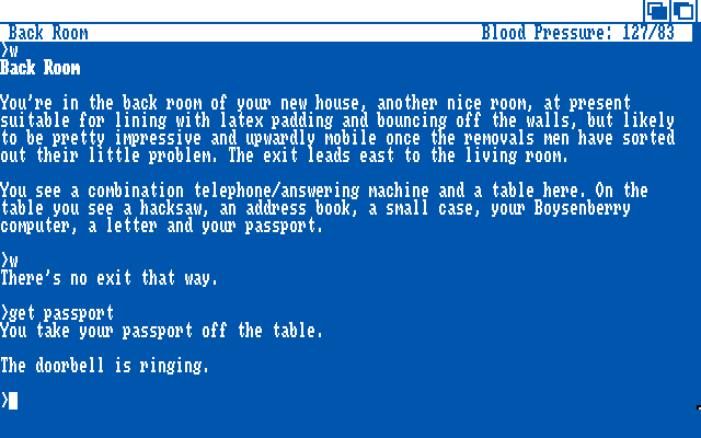 The gameplay involves typing commands composed out of verb and object combinations, used to interact with the game world and solve puzzles. In addition, a special "blood pressure" meter will gradually fill itself the more the protagonist is bothered by bureaucratic annoyances. Once this meter is completely full, the player character suffers an aneurysm, and the game ends.