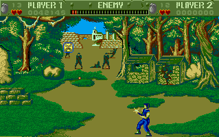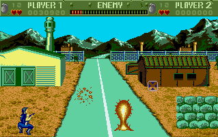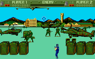 The enemies throughout the five levels come thick and fast and there are many of them. They include normal foot soldiers, tanks, helicopters and end of level bosses such as submarines and war machines. Just about everything on the screen can be blown up or shot. There are bonus points to be picked up for destroying buildings and weapons to be picked up from the enemy, such as machine guns and shotguns. A two-player mode is also available.