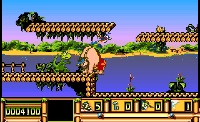 You are Carlos, a fat man wearing a black beard and bright coverall. You start your travels accompanied by a parrot in the jungles full of animals. During the game you should jump your way through 5 different levels full of different inhabitants (such as clowns, rats, monkeys, golf-players, etc.), climbing the ladders, entering the passageways to teleport to another locations, using the supporting devices (such as powder kegs to jump higher), collecting the different kinds of useful items from the chests, killing the enemies jumping over them, blowing them away summoning the limited amount of whirlwinds in the visible area, or morphing to the bull for limited amount of times. The parrot is flying over you and helping you to eliminate the flying enemies. On each level you have to gather the keys to open the gates, push some switches or levers, and collect certain items for some kind of picture.