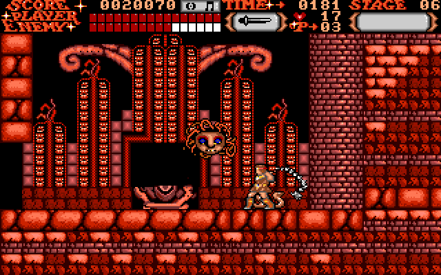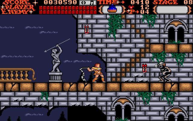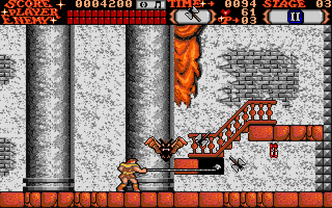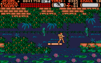 Castlevania is a side-scrolling platform action game. The player takes the role of Simon Belmont, who is able to jump and crack his whip directly in front of him. Power-ups can be obtained by defeating enemies or by whipping candles that appear in the castle. One such power-up increases the power and length of Simon's whip. Different weapons can be gathered which consume hearts when used, these hearts can also be collected from monsters and candles. Additionally, some walls will hide secrets such as the health-restorative turkey or the Double and Triple shot abilities for the weapons Simon has collected. At the end of each section of the castle is a boss, which must be defeated. Progression through the castle eventually leads to a confrontation with Count Dracula himself.