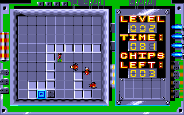 While the same set of rules applies to each level, there are many different kinds of levels. Some are action-oriented and some are puzzle-oriented. Most levels have a time limit. Types of levels include solving a block-pushing puzzle to clear a path, dodging enemies, and moving through a maze. Levels can be skipped by entering an appropriate four-letter non-case-sensitive password. For the PC versions, game progress is automatically saved. If one is having a lot of trouble with a level, the game allows the player to skip to the next level. Progress is measured in terms of completed levels and player score, which is a sum of the scores obtained on each level. Level scores for timed levels can be improved by quickly completing the level, and scores on all levels can be improved by using fewer attempts to complete the level.