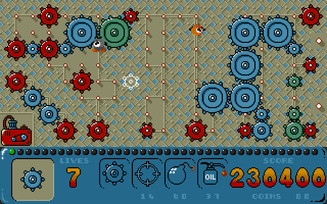 This top-down puzzle game starts with a screen featuring a number of red cogs at different parts of the screen, and a grid of pegs (which become less complete on later levels). Your task on each level is to use a number of gears of one of 3 different sizes to ensure that all the cogs are linked together. All this has to be completed before the engine overheats.