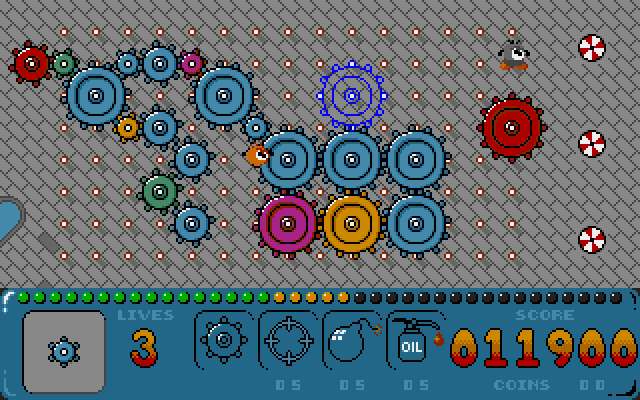 Making life harder are two creatures with the peculiar name "Poffins". One of these goes around removing pegs, and the other causes the engine to overheat further. They can be shot out of the way, or have gears placed over them to stop them.