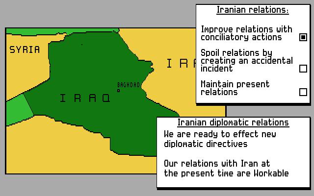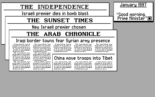 Conflict is a political/strategy simulator, inspired by a prediction of how events in the Middle East could unfold in the 1990s. In this 1997, the Israeli prime minister dies (either by assassination or by bomb blast), and you're appointed as the new prime minister.