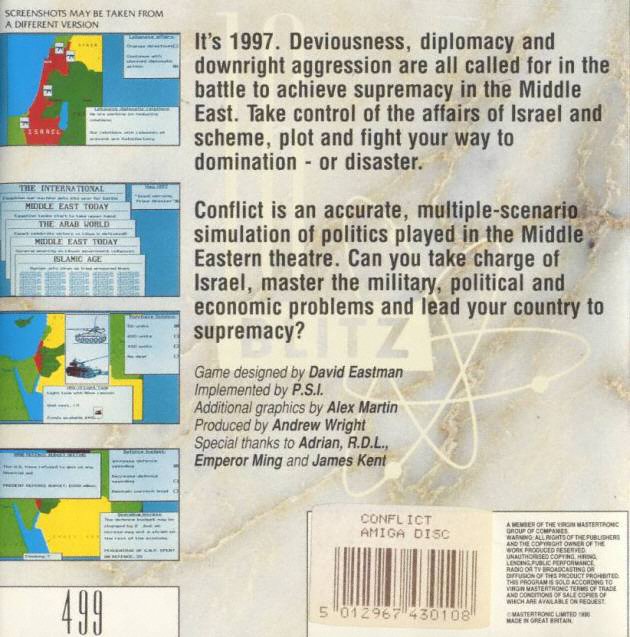 | __long_description | Conflict is a political/strategy simulator, inspired by a prediction of how events in the Middle East could unfold in the 1990s. In this 1997, the Israeli prime minister dies (either by assassination or by bomb blast), and you're appointed as the new prime minister.