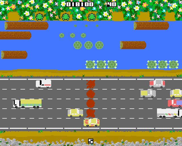 The basic gameplay involves guiding a frog into one of 7 home-bases at the top of the screen, which have hard barriers either side of them (avoid these). This involves first guiding him across a road, avoiding the vehicles, then over a river using moving logs.