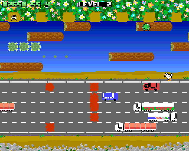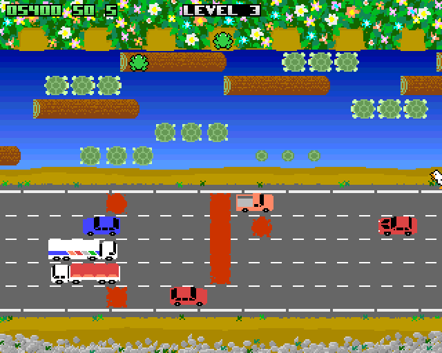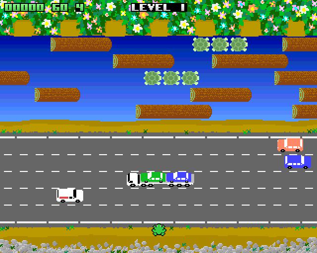 If you can't remember, or if you have never played the game before (where have you been?), the basic idea of the game is to get your frog from one side of the road (at the bottom of the screen), over the river and into your home (at the top of the screen). To complete a level you must dodge cars and jump on logs, while avoiding snakes, alligators and otters. Bonuses are awarded for getting the bugs that momentarily appear, escorting lady frogs to their home and getting five frogs safely home.