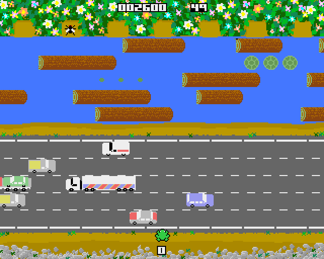 The basic gameplay involves guiding a frog into one of 7 home-bases at the top of the screen, which have hard barriers either side of them (avoid these). This involves first guiding him across a road, avoiding the vehicles, then over a river using moving logs.