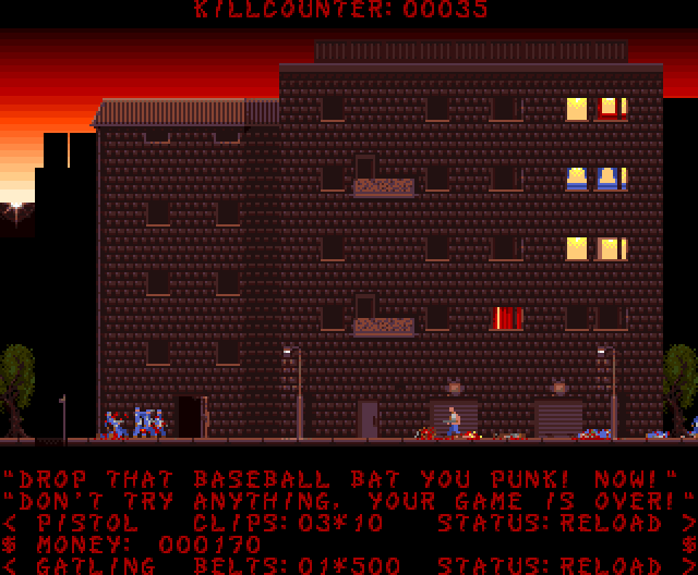 | __long_description | Damage is a violent game about the character Michael Modelcitizen. He was the perfect human who had everything but found out that it wasn’t enough, so he became crazy. You take control of Michael Modelcitizen and start the game with only a simple baseball bat inside his flat. Once outside you can walk around the huge city killing people (including old ladies and children), stealing better weapons and narcotics. By using different narcotics it is possible to enhance the strength of Michael’s body.