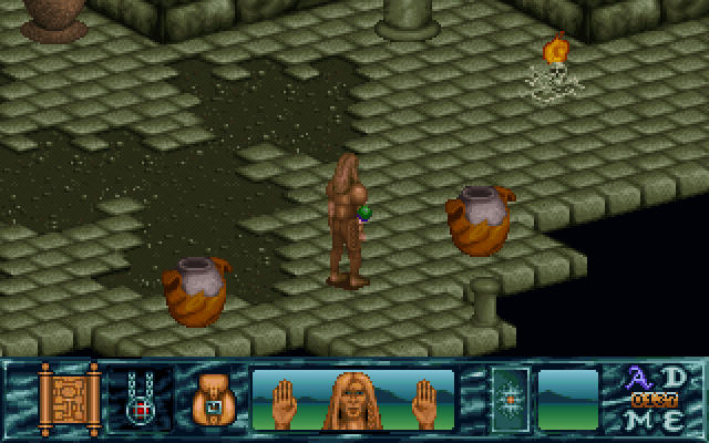 When searching the rooms of the dungeon there are various potions, herbs and magical pieces of equipment to be found. With the herbs the player can mix potions or spells, which are available in four categories: Attacking, defending, transforming and item manipulation. There is no free save system, there are special save points during the game. Every time he wants to save the player has to sacrifice one piece of equipment.