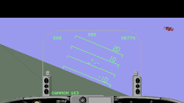 As the two players fly towards each other, the split screen is joint as they reach visual contact, and likewise split off again if they fly away from each other. If a player is shot down, he must take off again from his base, and the winner gains a point. In the time it takes for the other player to lift off, you are at liberty to fly to his base and bomb both him and his hangar. Beware, though, for there is an AA emplacement at the base. The anti air artillery alternates between slow-moving shots and explosive flak, the latter being much more difficult to avoid. If you manage to bomb the artillery, the opposing player is more or less at your mercy – at least until the artillery is regenerated or if he manages to avoid your bombs and shots to shoot you down.