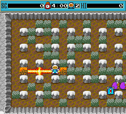 The range of Bomberman's bomb explosions can be upgraded with time, but if he dies, the range resets back to the minimum range and Bomberman loses his previous skills. Some updates can make Bomberman walk through the walls, increase his speed, and give him some other assets to aid him in his quest to save the woman he loves.