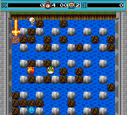 This top-down action-arcade game consists of nine levels per stage, each tougher than the other, and each final one consisting of the boss that will have to be dealt with. Bomberman can move horizontally and vertically and lay down bombs behind him, thus evaporating the enemies, but beware: Bomberman can block himself with his own bomb, and thus become a victim of his own bomb.