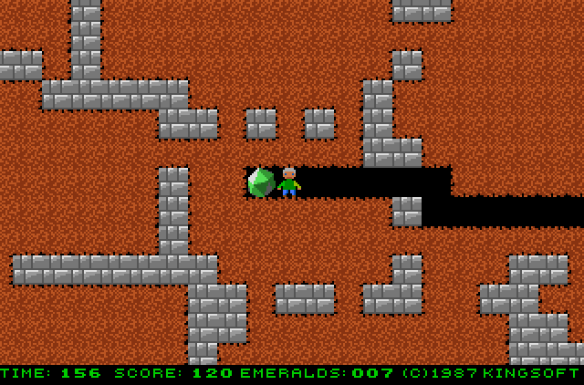 A conversion of the classic Boulder Dash game. The player is deep down in a cave and has to collect emeralds and diamonds while evading monsters - and the laws of gravity, which have the annoying habit of squishing him with huge rocks if he happens to stand beneath one as it falls down.