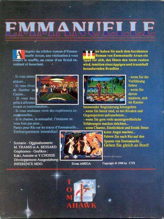 | __long_description | The plot of Emmanuelle is loosely inspired by Marayat Rollet-Andriane (Better known as Emmanuelle Arsan)'s Emmanuelle books, as adapted by Muriel Tramis. The character Emmanuelle in the game is a wife of French business man whose job requires constant travelling, thus leaving his wife unfulfilled. Emmanuelle has taken a lover, Marc, but later suffers pangs of conscience, because she still loves her husband. Emmanuelle travels to Rio de Janeiro in Brazil, to escape him, but is followed by Marc. The aim of the game is to augment Marc's erotic potential so he can seduce Emmanuelle again.