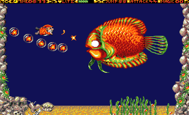A big boss stands at the end of each level, but defeating him is not enough to get access to the next: the hidden parts of the heart need to be found first. Besides platforming, there are are lot of enemies to fight. To do so, the magician has twelve weapons at his disposal which need a certain amount of energy to use. Just like the other two bars (jumping and life energy) it can be refilled by collecting crystals.