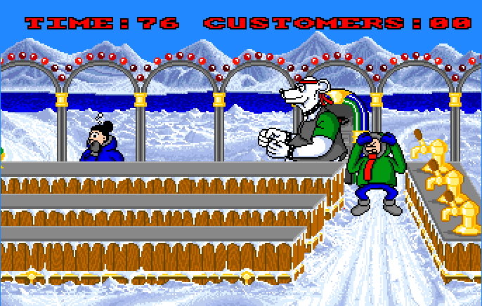 Miami Ice is a clone of Tapper, except that instead of beer you are serving ice cream to people. From one side of the screen you must ensure that each line has enough ice creams sent down it to match the number of people coming. Also ensure that you are ready to collect the empty cones when these are returned. Evidently, the taste of wafers is not popular near the poles.